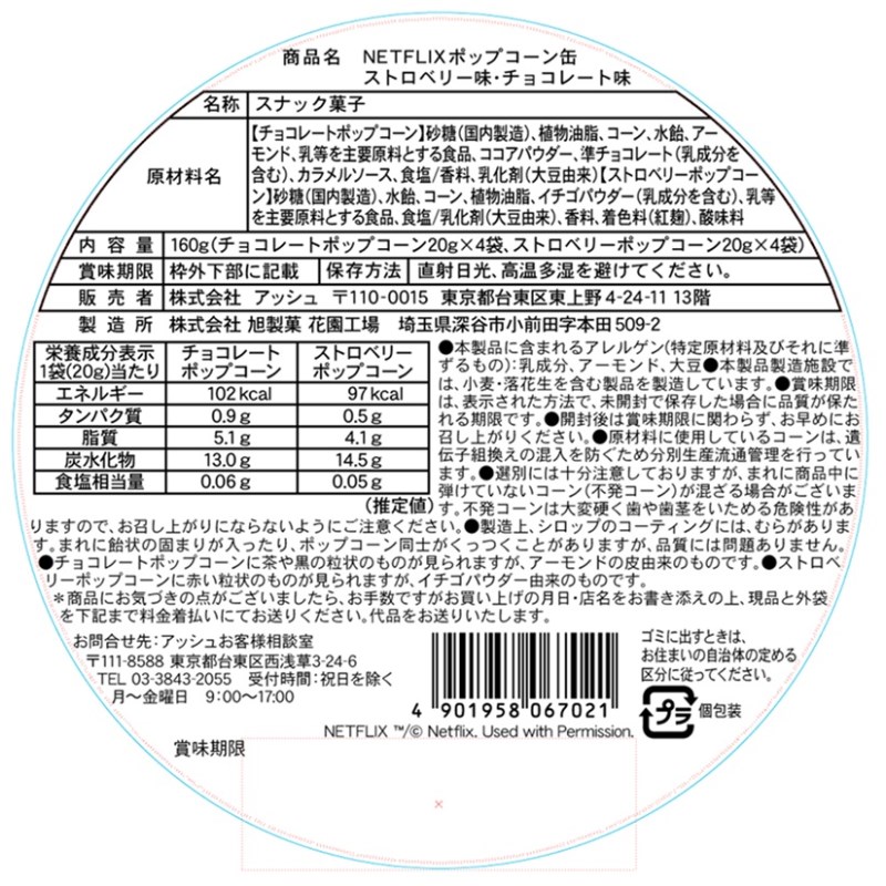 ストロベリー味X4袋、チョコレート味X4袋の計8袋のポップコーンが詰まったNETFLIXのポップコーン缶。