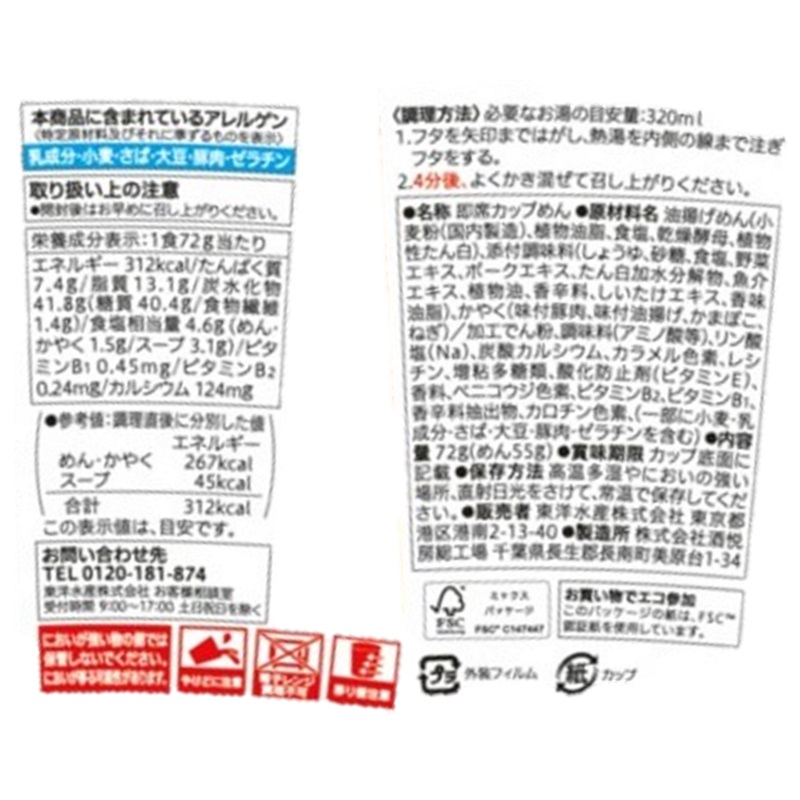 具材には味付豚肉、きざみ揚げ、かまぼこ、フリーズドライねぎ入り。