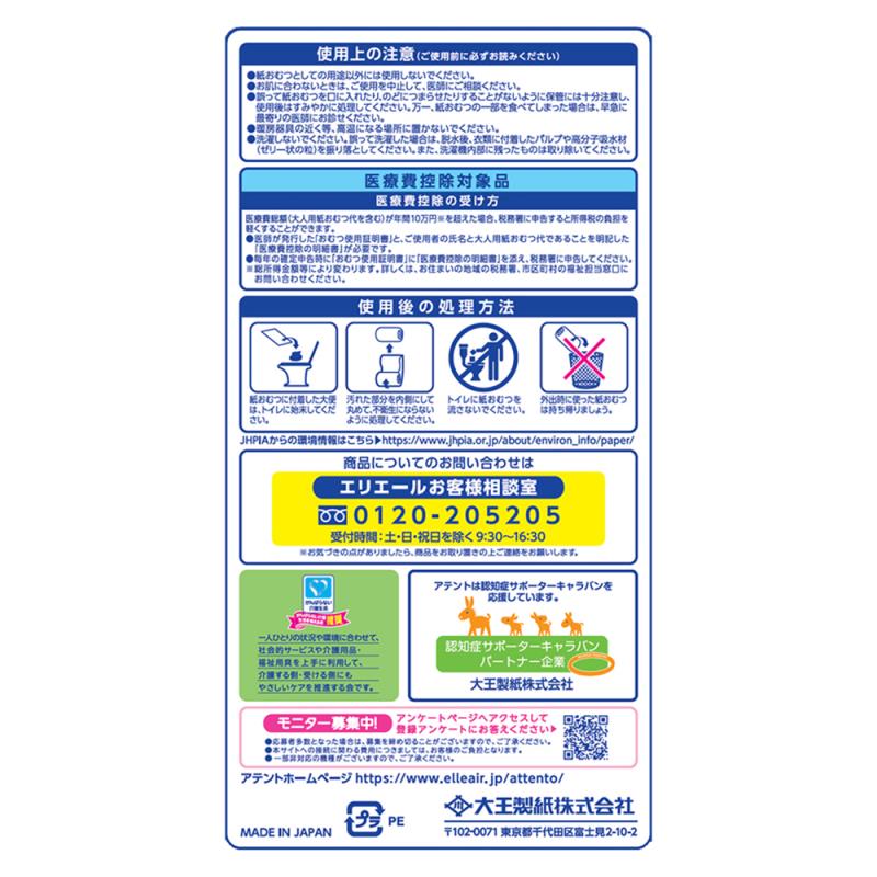 - ●表面材…ポリオレフィン系不織布●吸水材…綿状パルプ、吸収紙、高分子吸水材●防水材…ポリエチレンフィルム●伸縮材…ポリウ