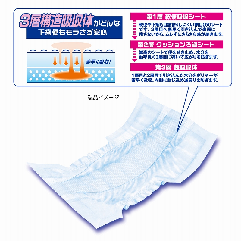 便をろ過する三層構造で、下痢や軟らかい便を吸収できます。