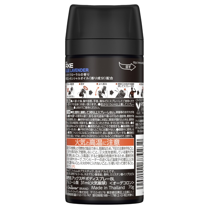 - LPG、変性アルコール、ネオデカン酸亜鉛、香料、ミリスチン酸イソプロピル