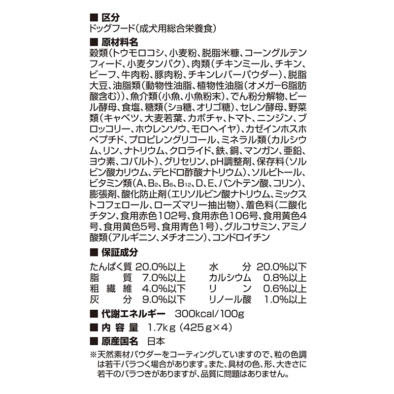 ビーフ、牛肉粉、豚肉粉、チキンレバーパウダー)、脱脂大豆、油脂類(動物性油脂、
