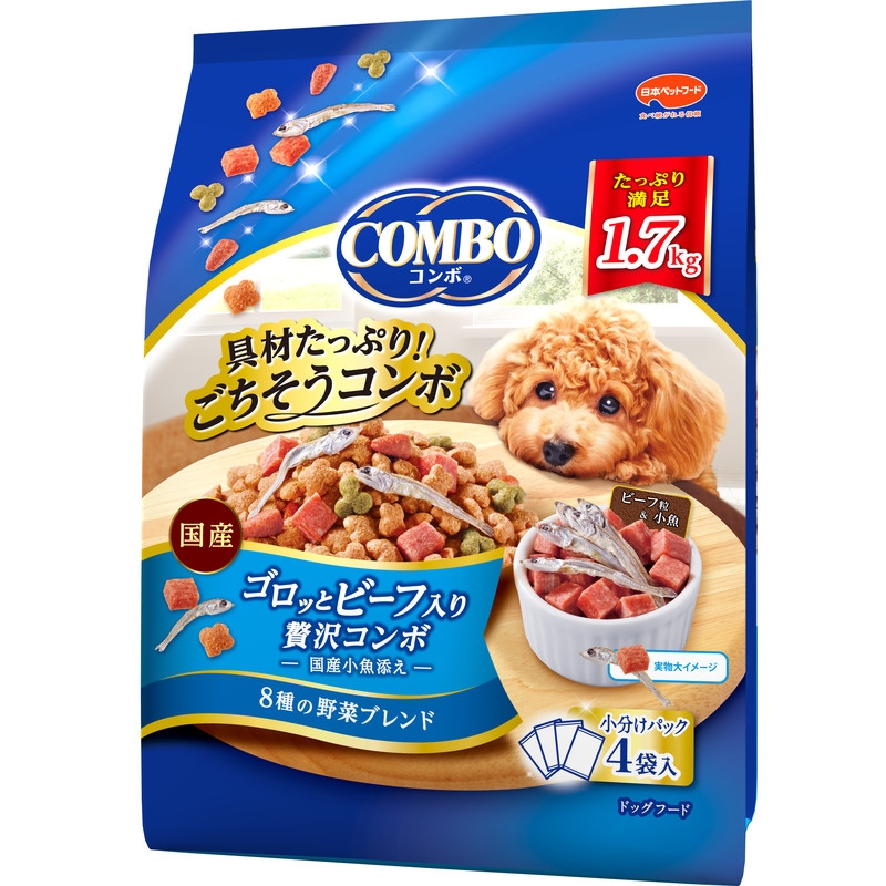 ・愛犬が大好きな「角切りビーフ粒」&「国産小魚」の贅沢なコンボ。