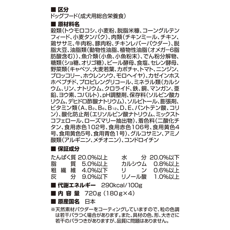 鶏ササミ、牛肉粉、豚肉粉、チキンレバーパウダー)、脱脂大豆、油脂類(動物性油脂、植物性油脂)、魚介類(小魚、
