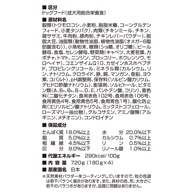 鶏ササミ、牛肉粉、豚肉粉、チキンレバーパウダー)、脱脂大豆、油脂類、小魚粉末、糖類、ビール酵母、食塩、セレン酵母、