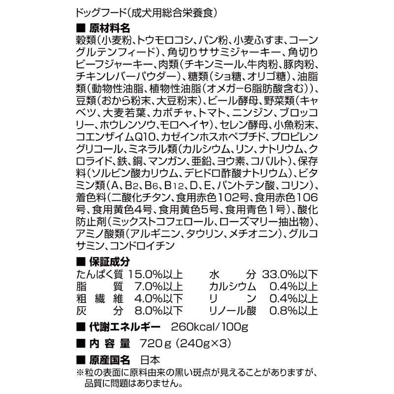 角切りビーフジャーキー、肉類(チキンミール、牛肉粉、豚肉粉、チキンレバーパウダー)、糖類、