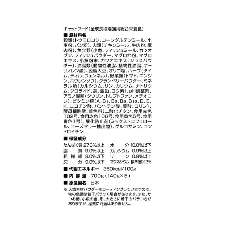 まぐろのおいしさたっぷりの4種粒に風味豊かなかつおぶし、カルシウム豊富な本物小魚を添えました。