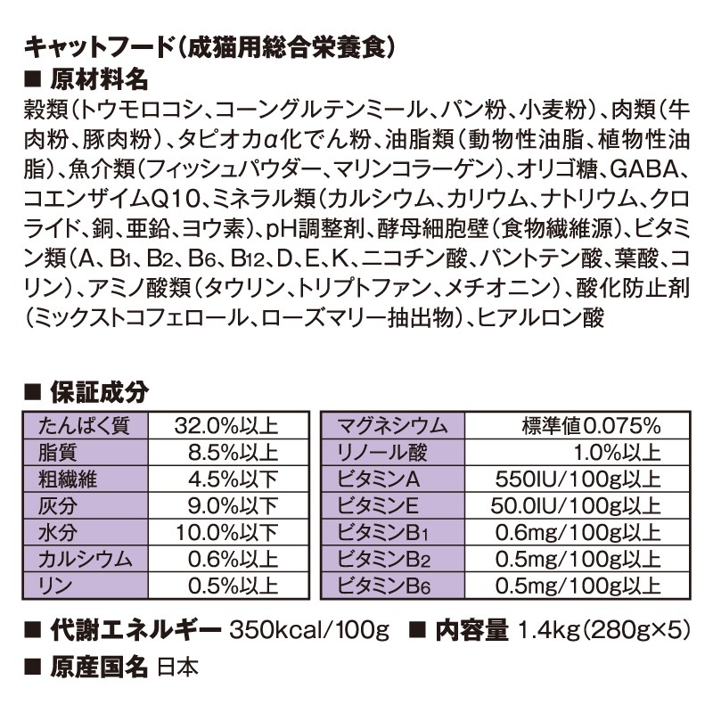 (動物性油脂、植物性油脂、Γ-リノレン酸)、魚介類(フィッシュパウダー、マリンコラーゲン)、オリゴ糖、GABA、
