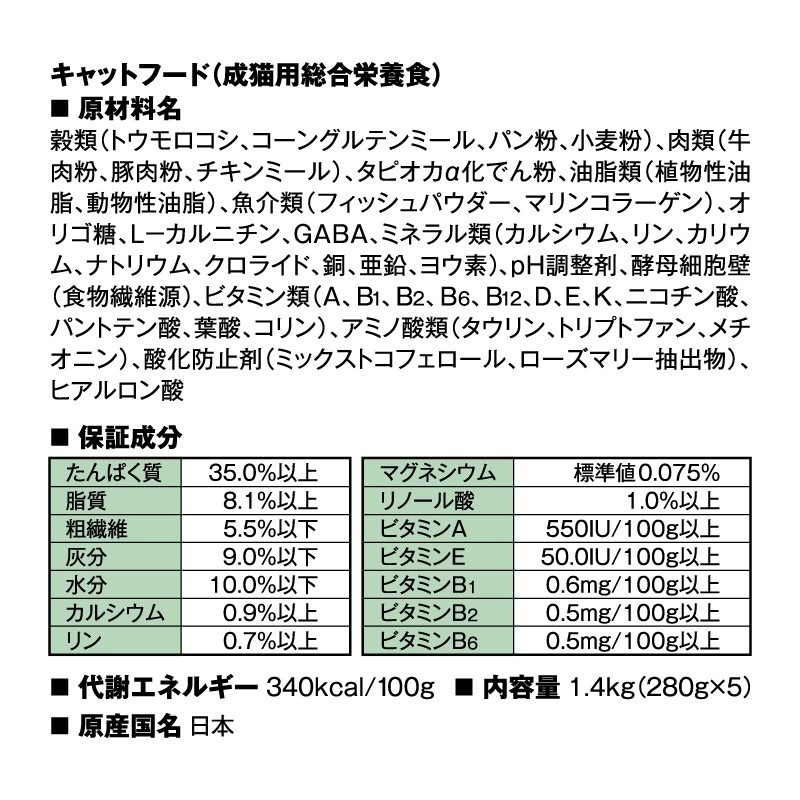 皮膚と毛艶の健康維持にマリンコラーゲン、ヒアルロン酸配合。ストルバイト尿石に配慮し、