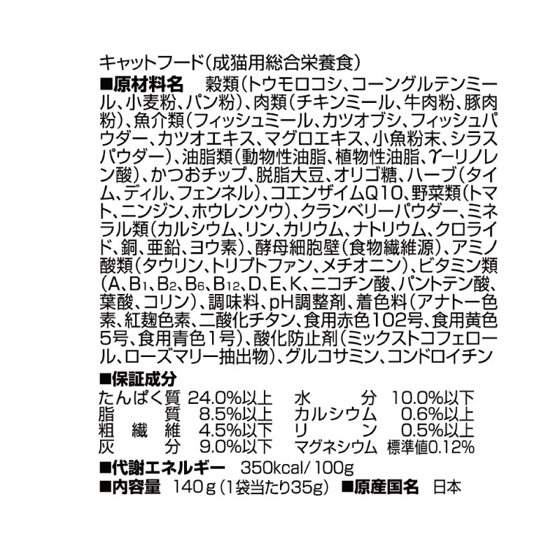 、油脂類(動物性油脂、植物性油脂、Γーリノレン酸)、かつおチップ、脱脂大豆、オリゴ糖、ハーブ(タイム、ディル、