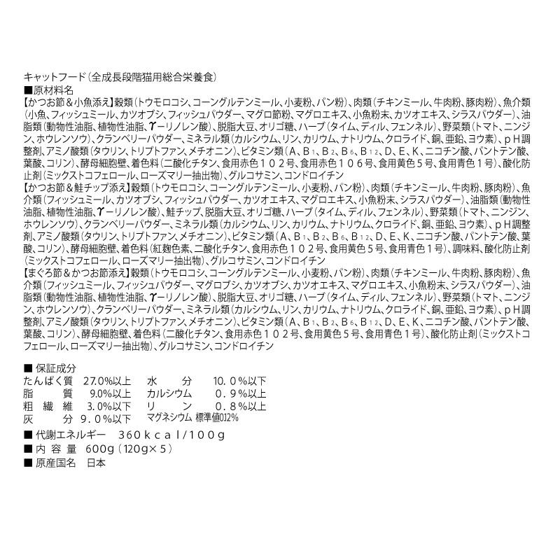 鮭チップ、脱脂大豆、オリゴ糖、ハーブ、野菜類、クランベリーパウダー、ミネラル類(カルシウム、リン、カリウム、