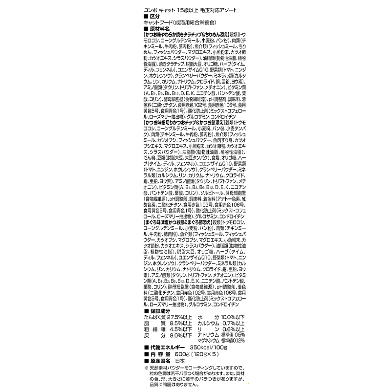 15歳以上の腎臓の健康維持を考えカルシウム、リンを調整。食物繊維で毛玉スッキリの3種アソート。小粒。