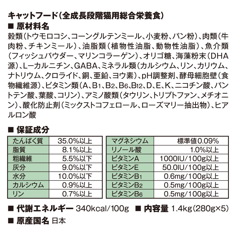 動物性油脂)、魚介類(フィッシュパウダー、マリンコラーゲン)、オリゴ糖、海藻粉末(DHA源)、L-カルニチン、