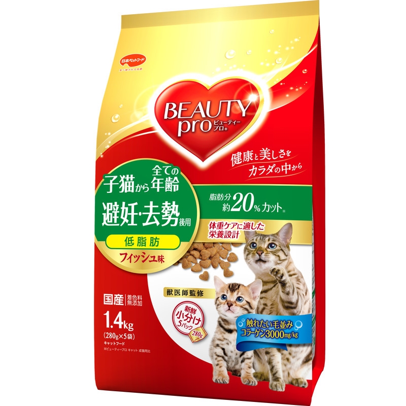 子猫から使える避妊・去勢後用。たんぱく質量は維持し、脂肪分約20%カットしたおいしいフィッシュ味。