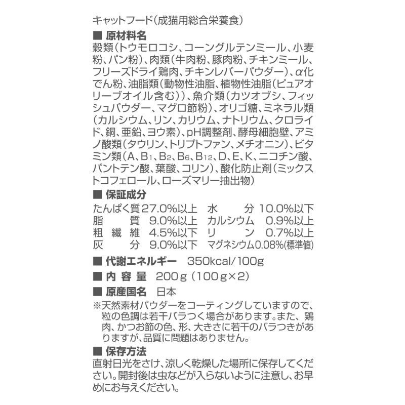 フリーズドライ鶏肉、チキンレバーパウダー)、α化でん粉、油脂類、魚介類(カツオブシ、フィッシュパウダー、
