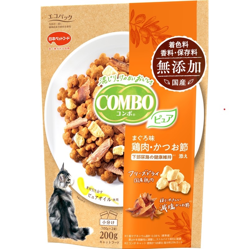 着色料・香料・保存料無添加のピュアなおいしさ。おいしいまぐろ味粒に国産鶏肉と減塩かつお節の本物素材。