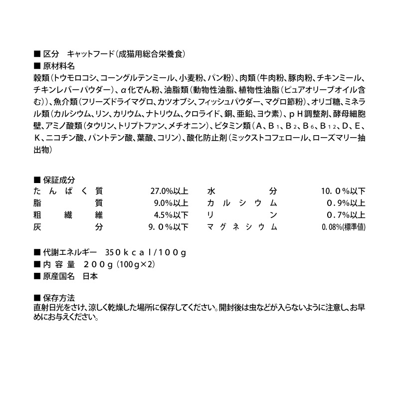 マグロ節粉)、オリゴ糖、ミネラル類(カルシウム、リン、カリウム、ナトリウム、クロライド、銅、亜鉛、ヨウ素)、
