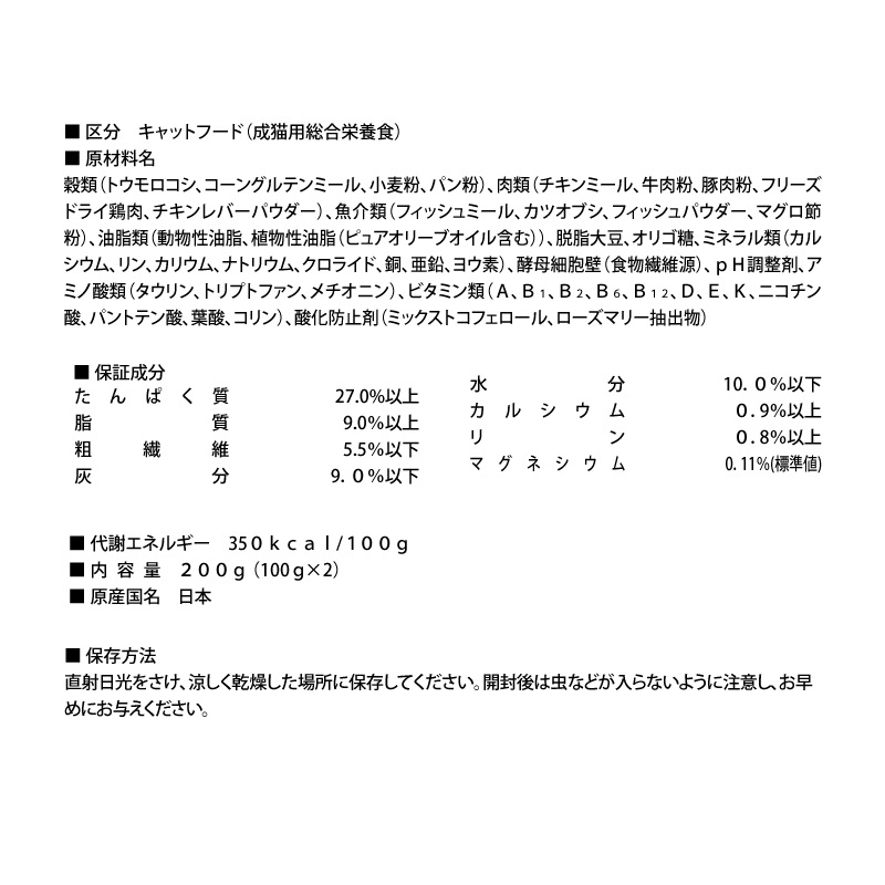 チキンレバーパウダー)、魚介類(フィッシュミール、カツオブシ、フィッシュパウダー、マグロ節粉)、油脂類、脱脂大豆、