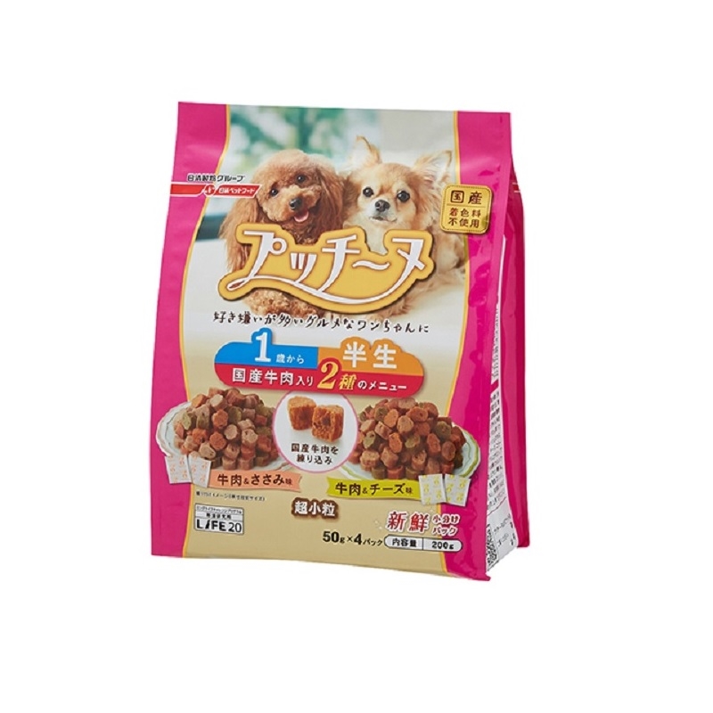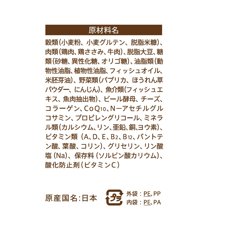 - 穀類(小麦粉、小麦グルテン、脱脂米糠)、肉類(鶏肉、鶏ささみ、牛肉)、豆類(大豆たんぱく)、糖類、油脂類(動物性油脂、植