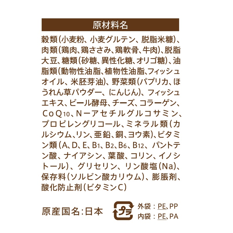 - 穀類(小麦粉、小麦グルテン、脱脂米糠)、肉類(鶏肉、鶏ささみ、鶏軟骨、牛肉)、豆類(大豆たんぱく)、糖類、油脂類(動物性