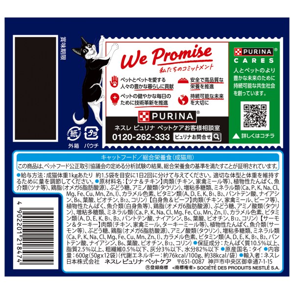 - 肉類(チキン、家禽ミール等)、植物性たんぱく、魚介類(ツナ等)、鶏脂(オメガ6脂肪酸源)、ぶどう糖