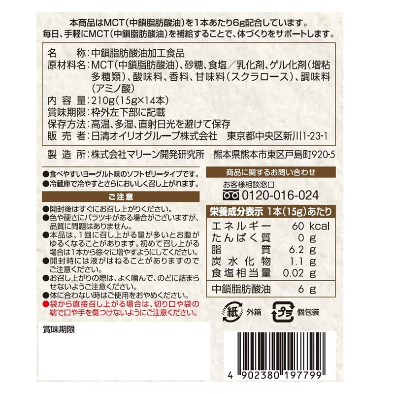 中鎖脂肪酸油を6g含有したスティックゼリー美味しく食べやすいヨーグルト風味のソフトタイプゼリー。