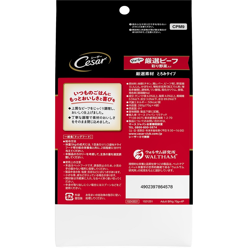 - 肉類(チキン、鶏レバー、ビーフ等)、野菜類(にんじん、かぼちゃ)、増粘安定剤(加工でん粉、増粘多糖類)、調味料、