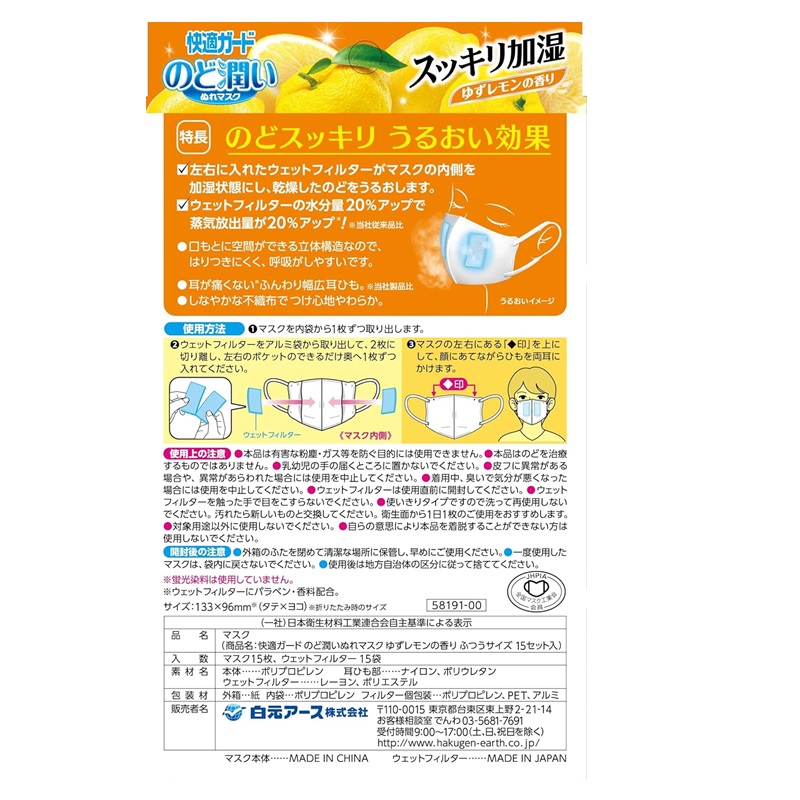 左右に入れたウェットフィルターがマスクの内側を加湿状態にし、乾燥したのどをうるおします。●