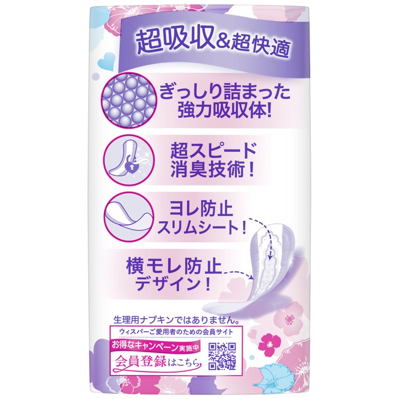 ウィスパー史上初※の「超スピード消臭技術」によりニオイをすぐに消臭するほか、うすくてさらさらな「ぬれてもスリムシート」だ