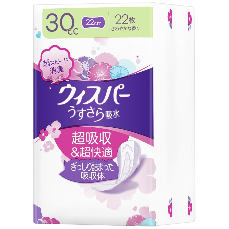 あのウィスパーからついに吸水ケア商品が誕生!ウィスパーうすさら吸水なら、ぬれてもスリムシートで、サッと吸水、スッと消臭。