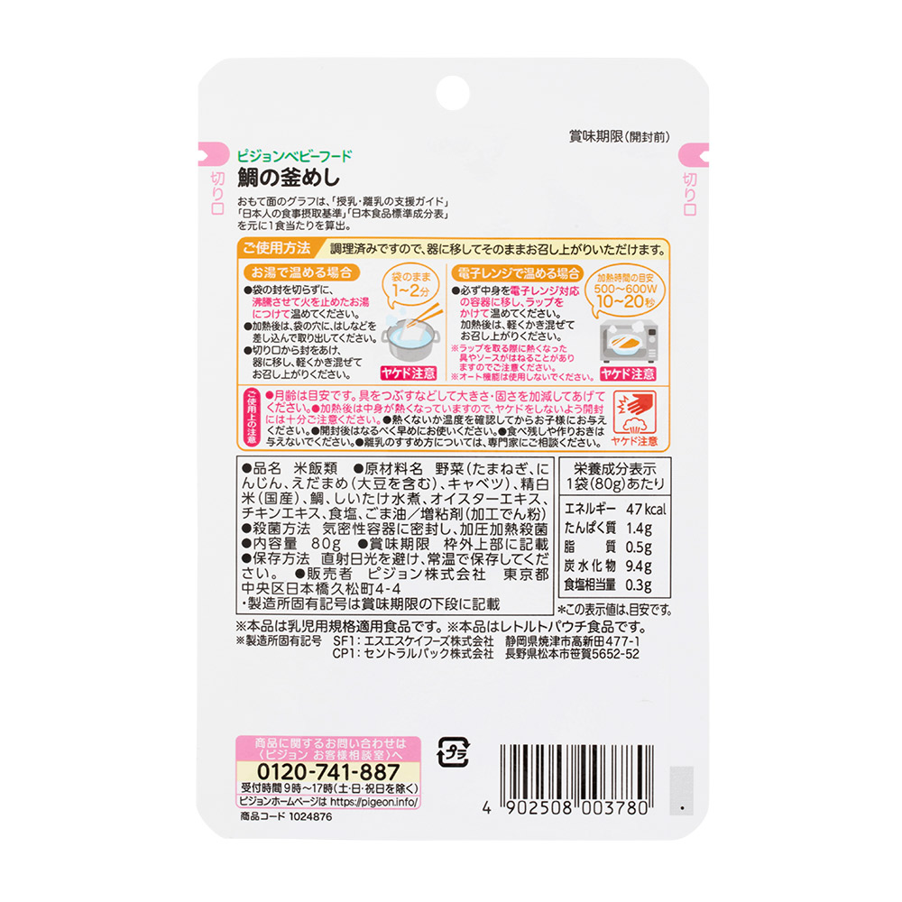- 野菜(たまねぎ、にんじん、えだまめ(大豆を含む)、キャベツ)、精白米(国産)、鯛、しいたけ水煮、