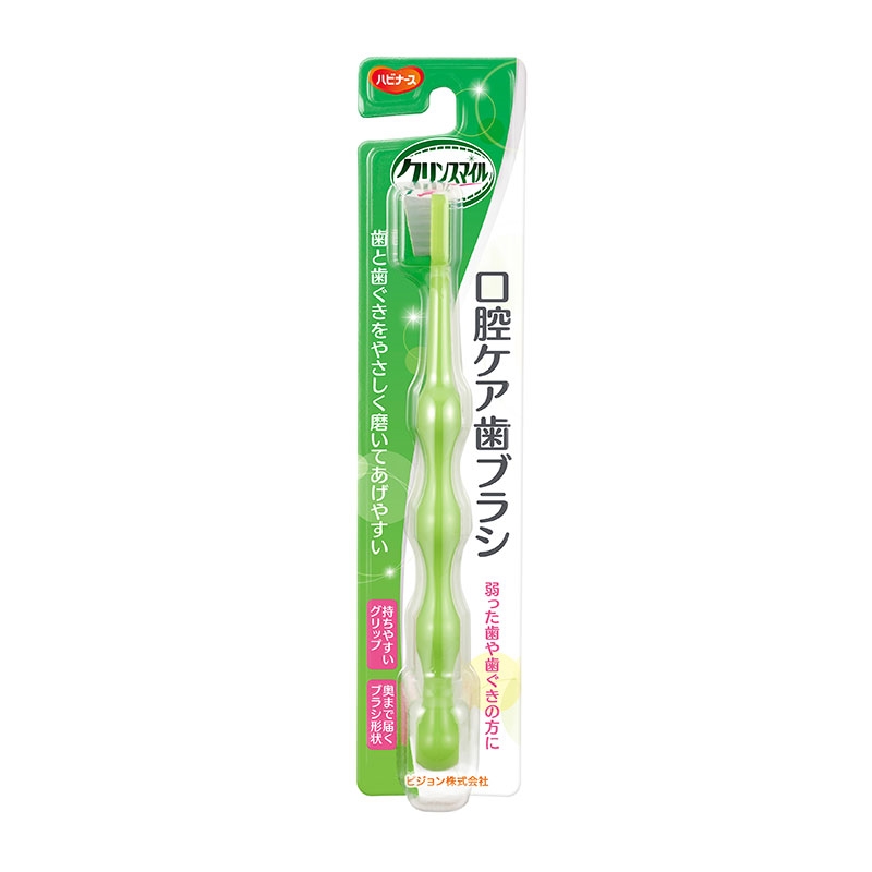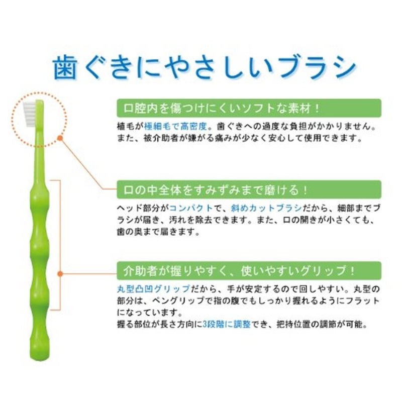 口腔内を傷つけにくい、歯ぐきにやさしい極細毛ブラシです。コンパクトな斜めカットブラシなので、すみずみまで磨けます。介助し