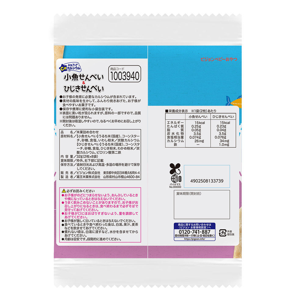 お子様の発育に必要なカルシウムが含まれています。【小魚せんべい】26mg/袋。【ひじきせんべい】34mg/袋。