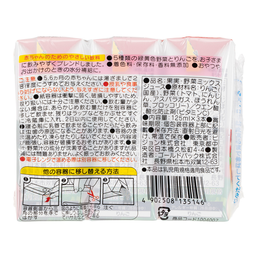 果汁+野菜汁100%(果汁70%)。※5・6ヵ月の赤ちゃんには、湯ざましで2倍程度にうすめて与えてください。