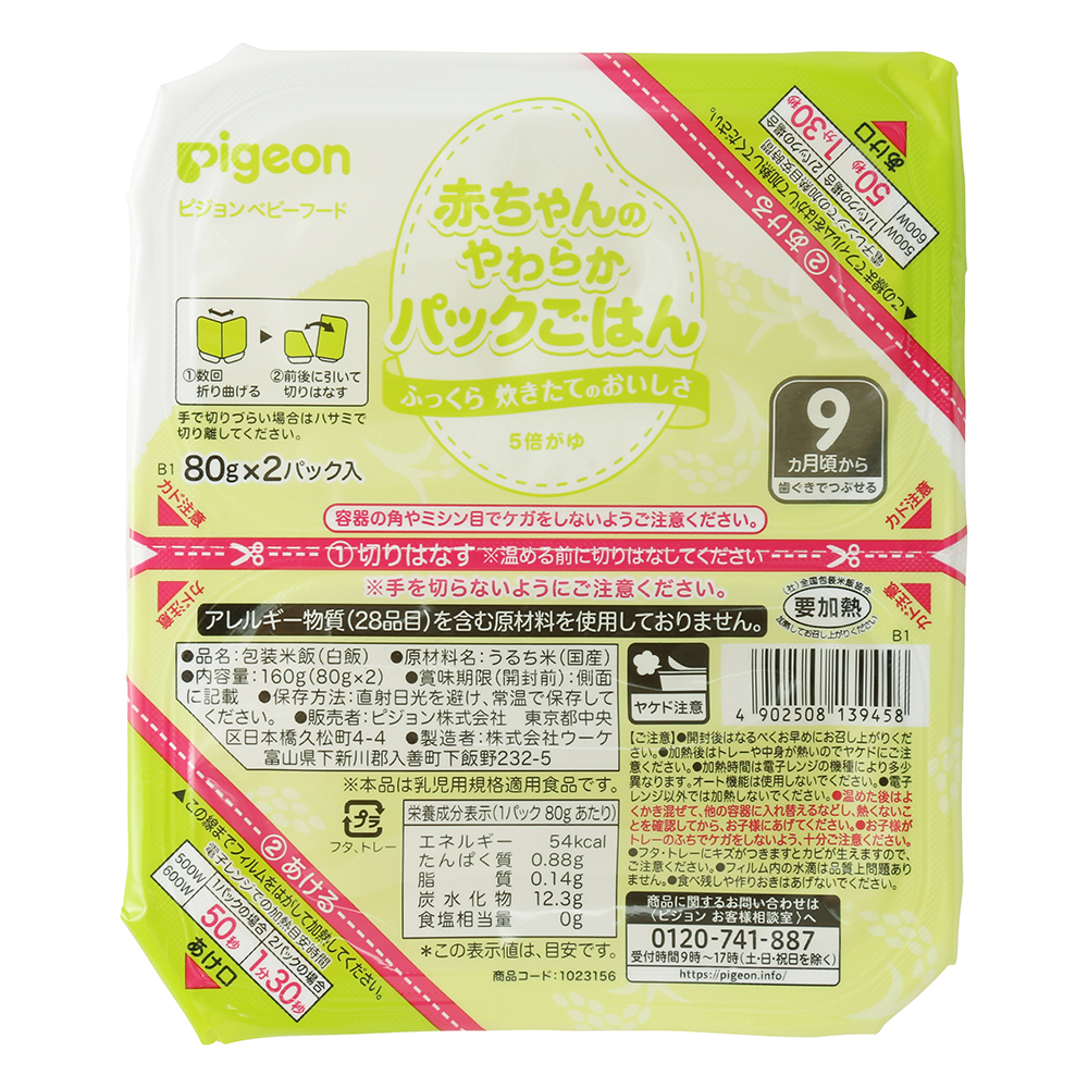 電子レンジで50秒!炊き立てのおいしさにこだわった赤ちゃんのためのパックごはん。歯ぐきでつぶせる9ヵ月頃に合わせた5倍がゆです。