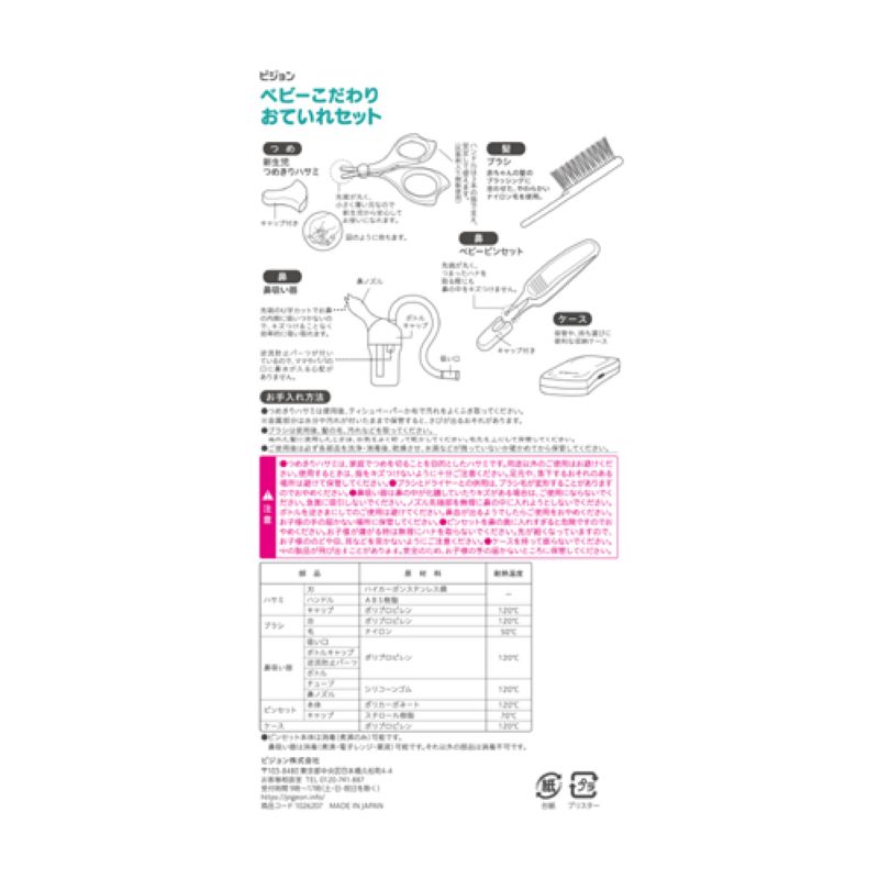 新生児つめきりハサミ、ブラシ、ベビーピンセット、鼻吸い器お鼻すっきり、収納ケース各1
