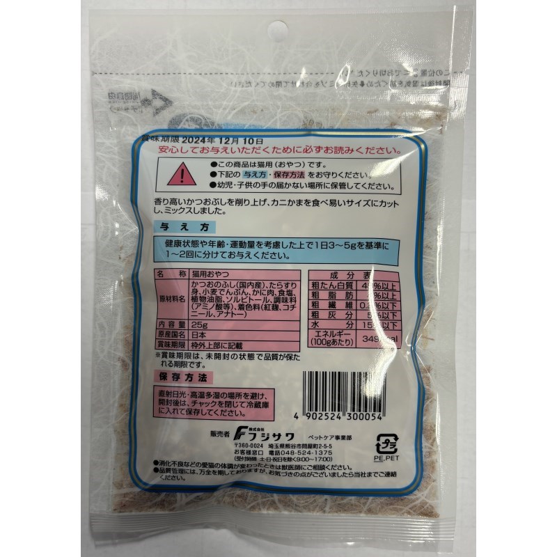- かつおのふし、たらすり身、小麦澱粉、カニ肉、食塩、食物油脂、ソルビトール、調味料(アミノ酸等)