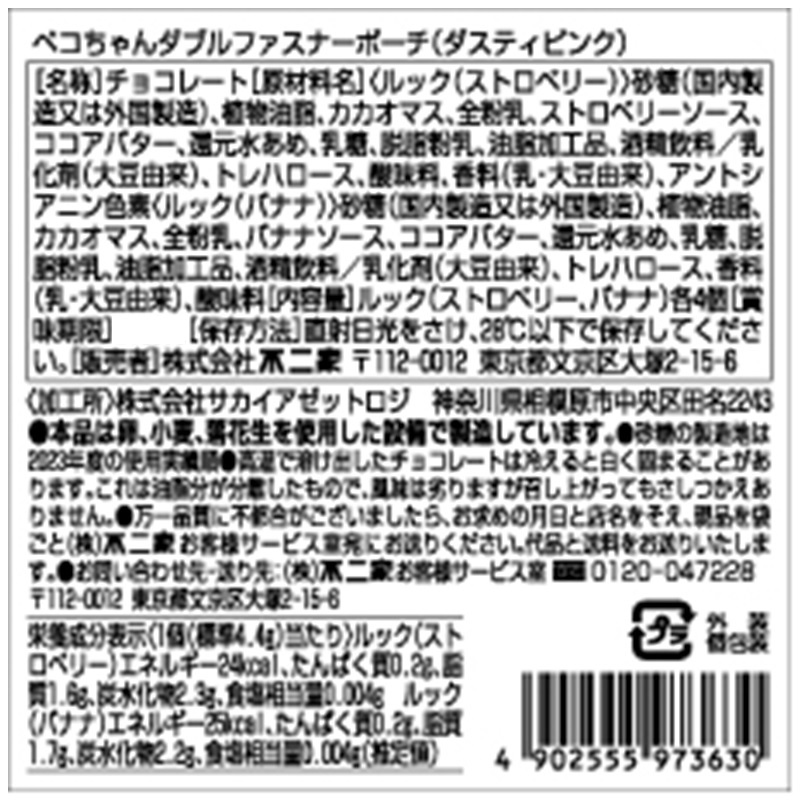 ルック8個入の普段使いにも最適な可愛いオリジナルチャーム付きペコちゃんダブルファスナーポーチです。