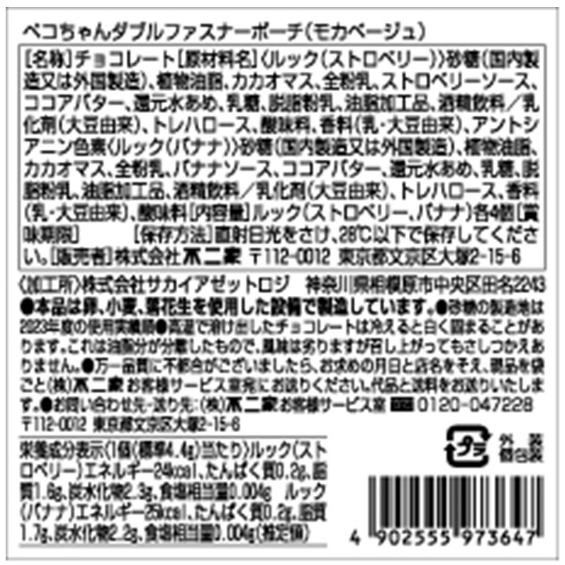 ルック8個入の普段使いにも最適な可愛いオリジナルチャーム付きペコちゃんダブルファスナーポーチです。