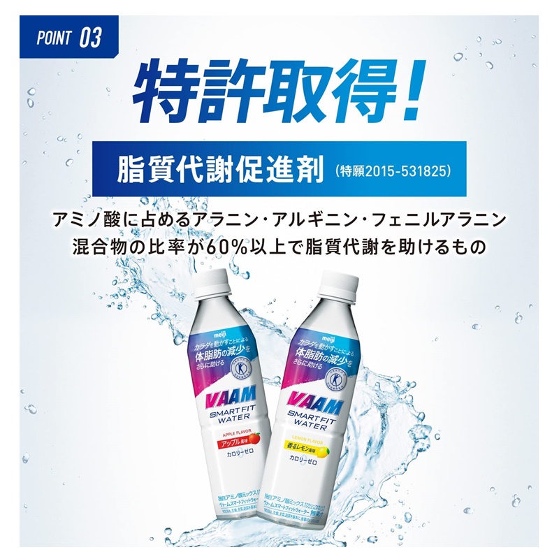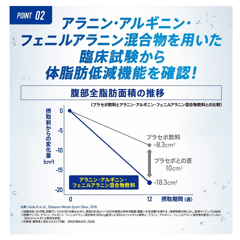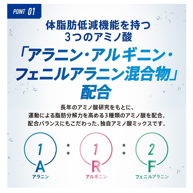 運動時や日常の水分補給に適したニアウォータータイプなので、スッキリおいしく飲み続けて体脂肪を減らすことが出来る。