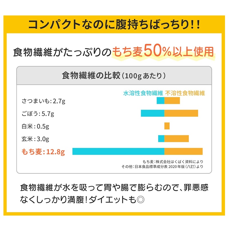もち麦&雑穀を合計79%使用(原材料のうち57%がもち麦、22%は十六雑穀)、白米不使用です。