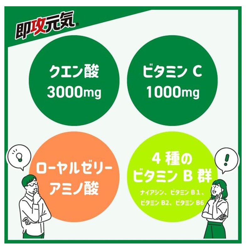 クエン酸3000mgにビタミンC1000mgを配合し、元気の素となるアミノ酸、ローヤルゼリーに加え、エネルギー代謝を高め