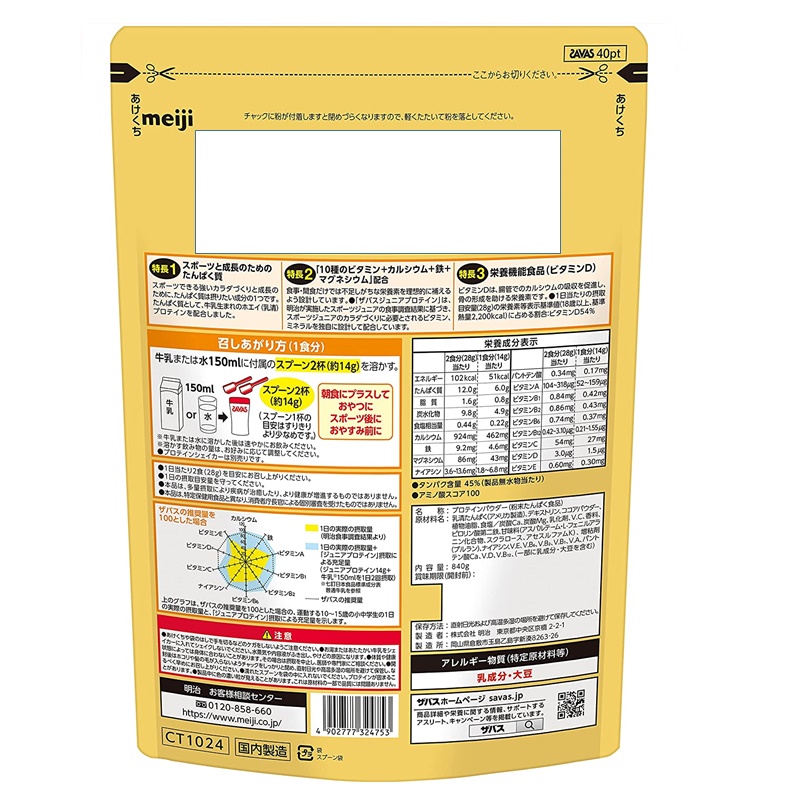 1日2食(約28g)を目安にお召し上がりいただくことで、スポーツジュニアが1日に必要とする