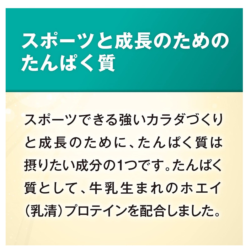 スポーツできる強い体づくりと成長のために、牛乳生まれのホエイ(乳清)たんぱく質を配合。