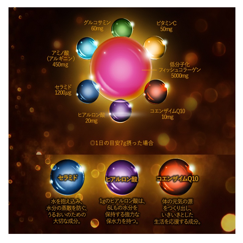 コエンザイムQ10、ヒアルロン酸、セラミド、グルコサミン、アミノ酸「アルギニン」、ビタミンC