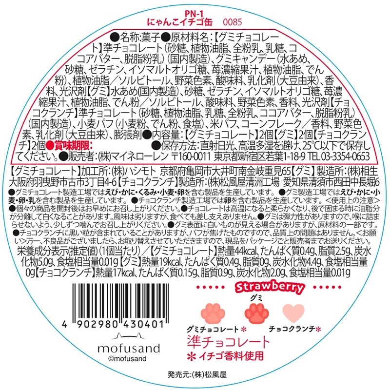 ぷっくりとかわいいエンボス仕様の缶に、いちご風味の肉球型グミチョコレート、クランチ、肉球型グミをアソートしました。