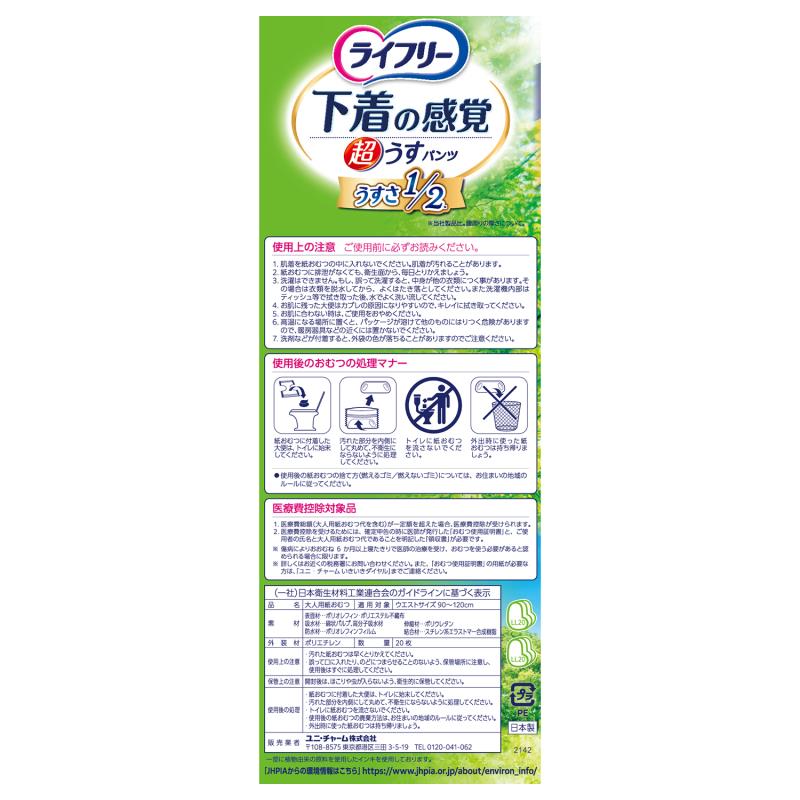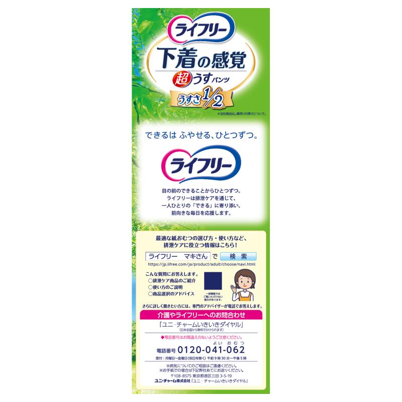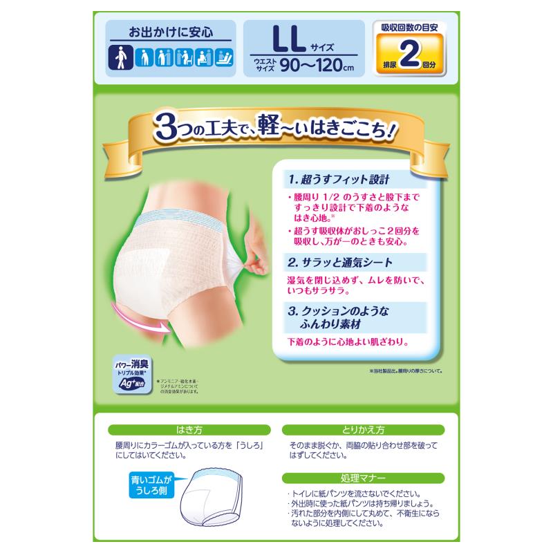 ●超うす吸収体なので下着のようにすっきりフィットし、全面通気シートで、ムレずにさらさら、見た目もはきごこちもすっきり。