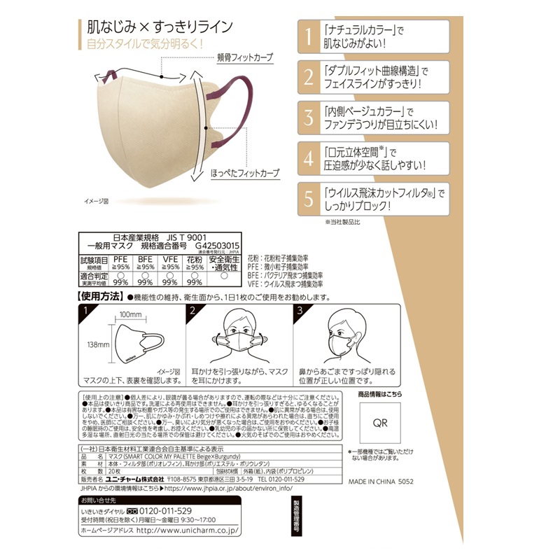 なじみのよいナチュラルカラーとフェイスラインがすっきりみえるダブルフィット曲線構造で顔なじみがよい。