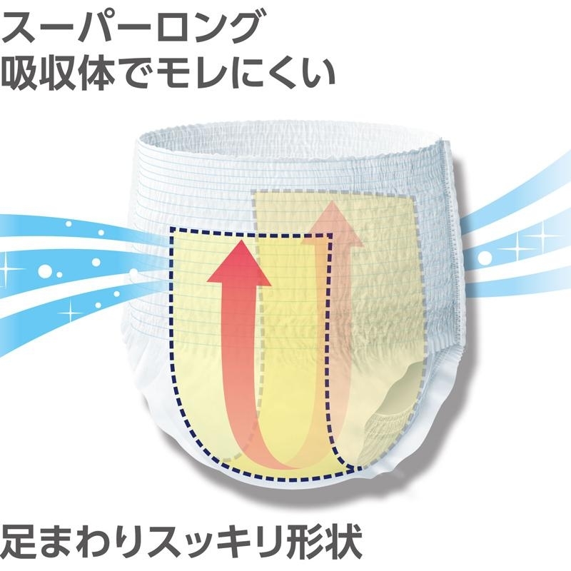 cc吸収です。「スルッとゾーンR」がウエストゴムの巻き込みを防ぎ、おしりに引っかかりません。 軽い力でウェストが2倍に広