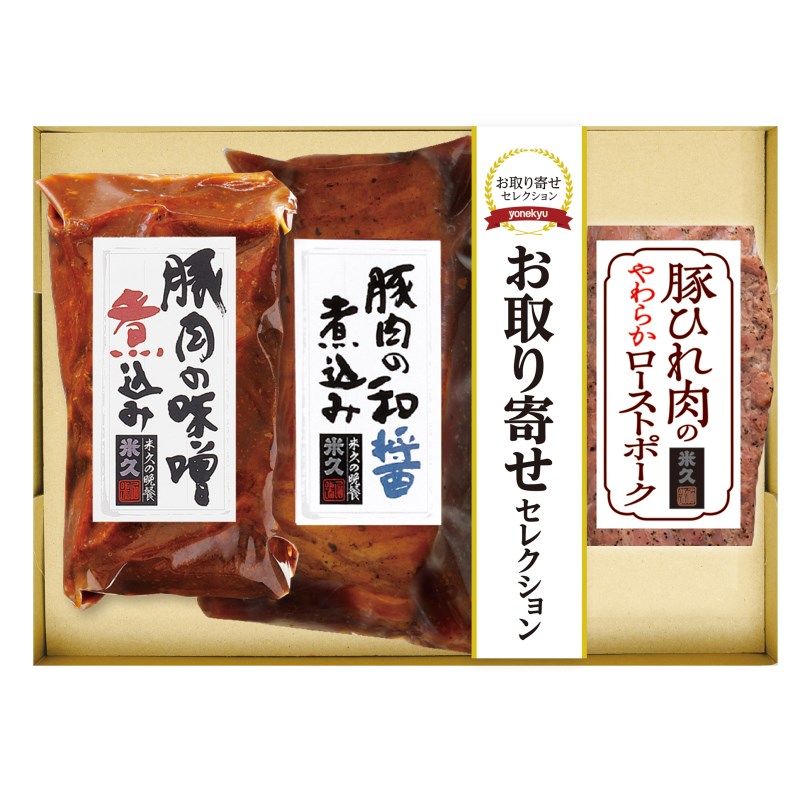 - 豚肉の味噌煮込み210g、豚ひれ肉のやわらかローストポーク100g、豚肉の和煮込み210g
